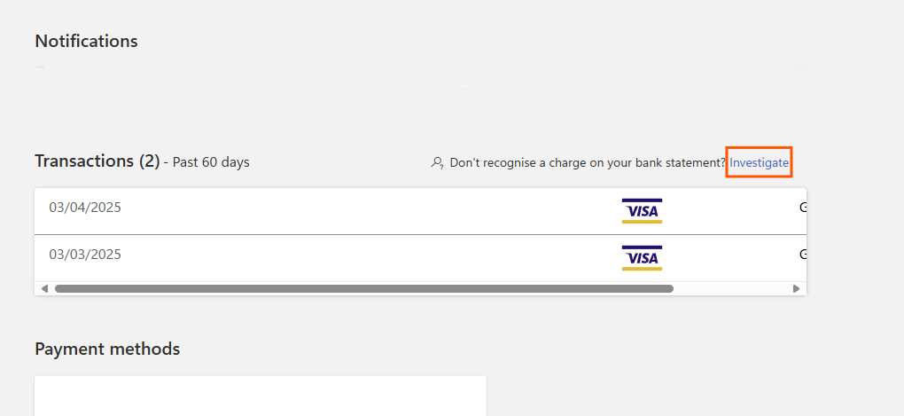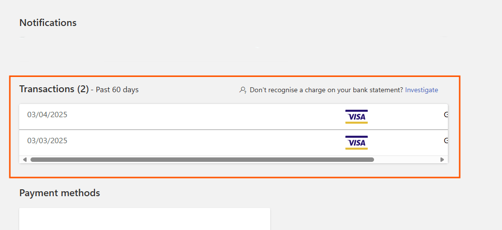 You will need to sign into your Microsoft account. Once you have done, you should see your payment methods on your account along with your Microsoft account balance. When the page loads, you should see a list of transactions in the past 60 days that have used your payment details.