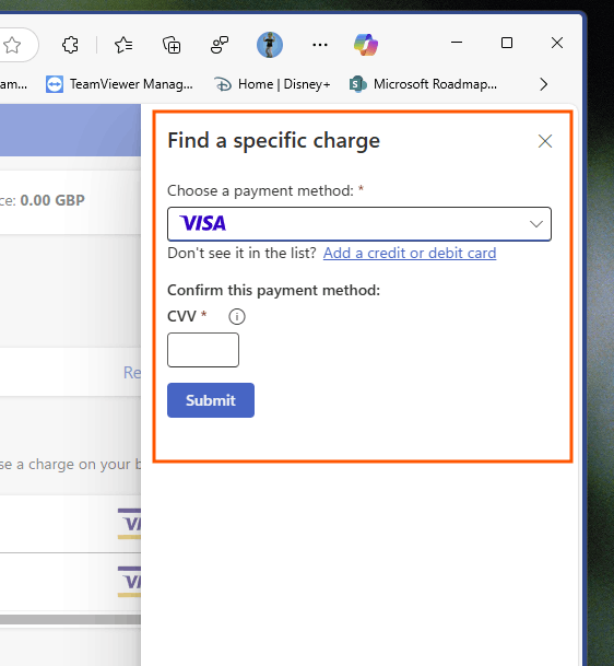 Please select the right card where money has been taken out of your account on. Then enter the CVV code that is on the back of the card. Once you have done this, please click onto submit.