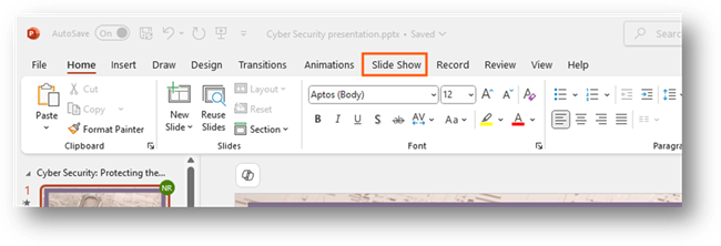 When you open your presentation, you will want to go to the tab Slide Show on your ribbon.