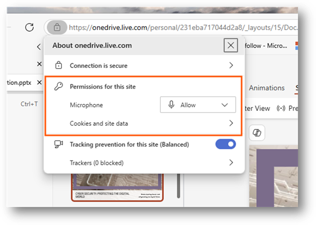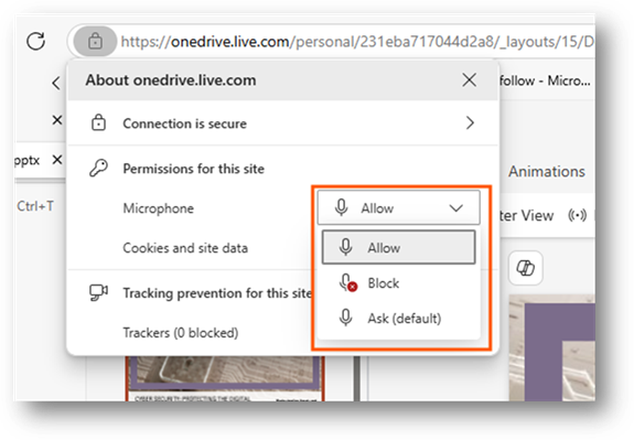 Please make sure that the microphone is set to allow. If it is blocked, please click onto the drop-down option for the microphone and change it to allow.