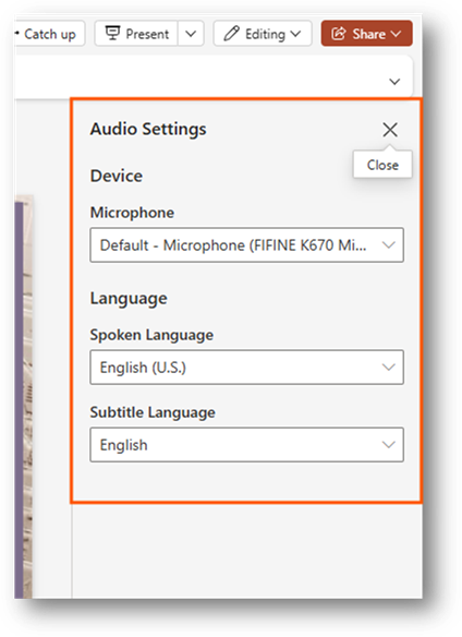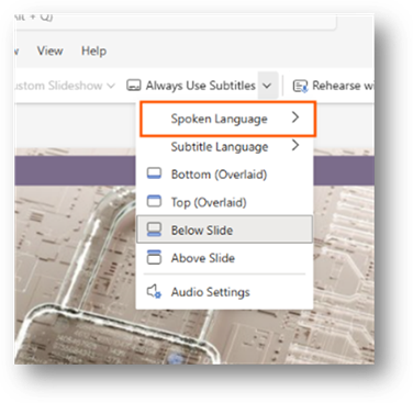 You can click onto a language you are going to be speaking in. This will save to your profile. By default, it will be set to the default language PowerPoint or Microsoft 365 is set to.
